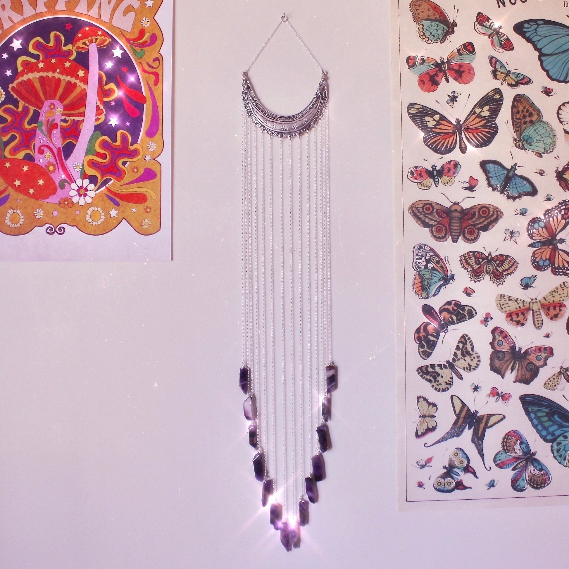 The Amethyst Mobile will quickly become a cherished treasure in your home. This work of art adds complexity and intricacy to any space it adorns. Long dangling ropes of silver chain lead to bright purple amethyst crystals. This piece exudes pure vintagey magic.