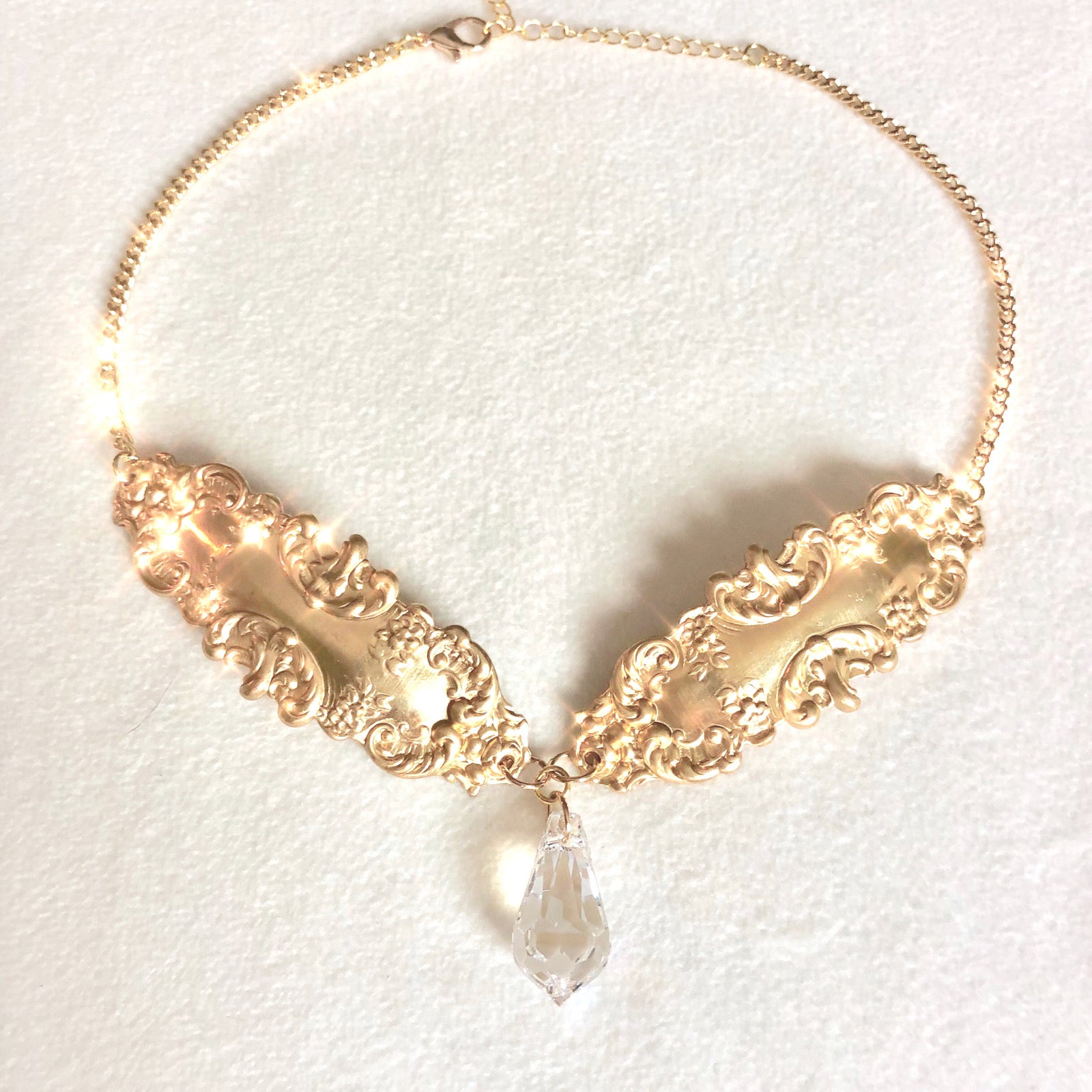 A regal, victorian-inspired piece, the new 'Mirrors' Choker will be stealing the show. It features a large iridescent teardrop crystal that casts prisms when hit by sunlight. The antique gold pendants on either side of the rhinestone are bent into a collar so as to fit your neck just right. It is an elevated fantasy piece that does not disappoint. Enjoy ♡