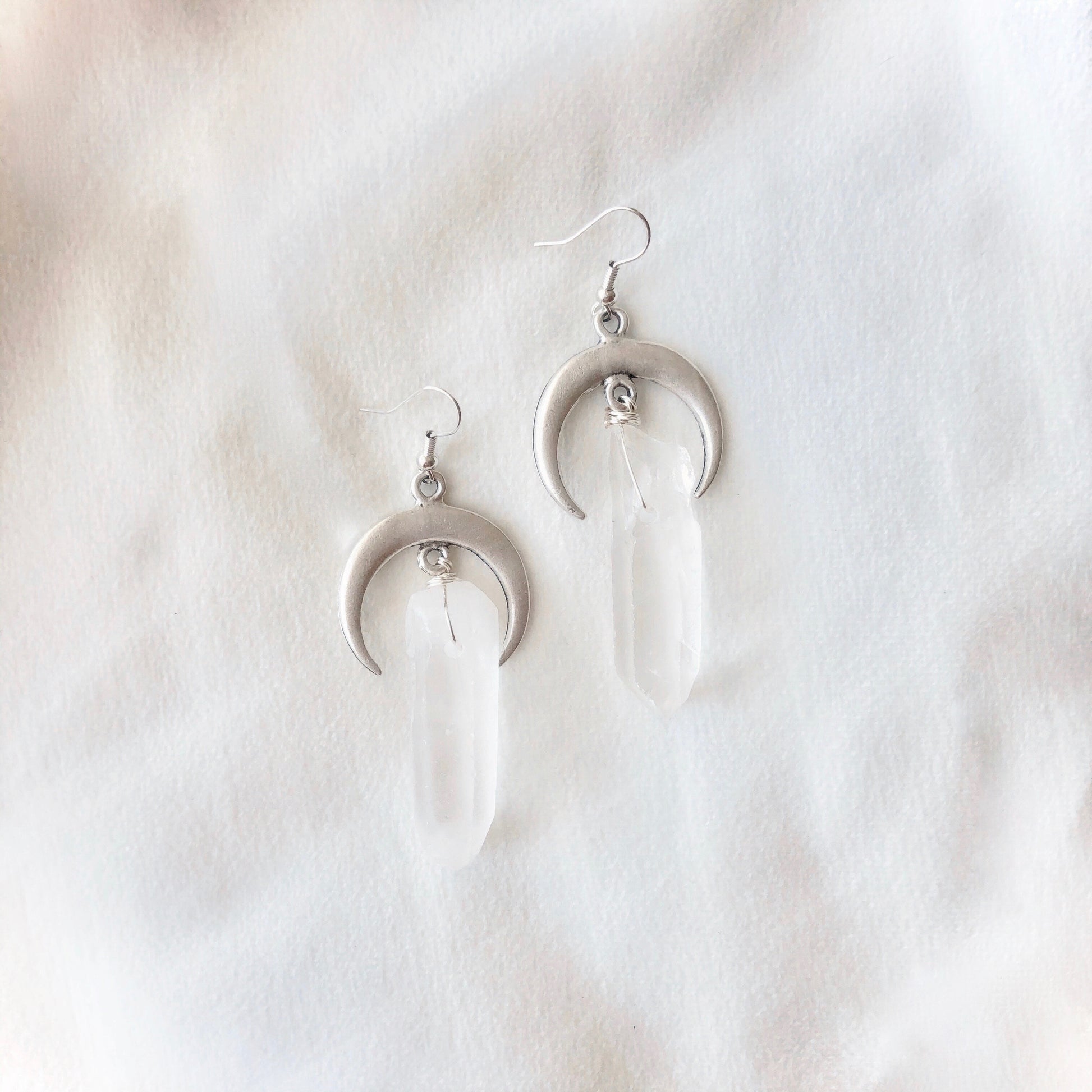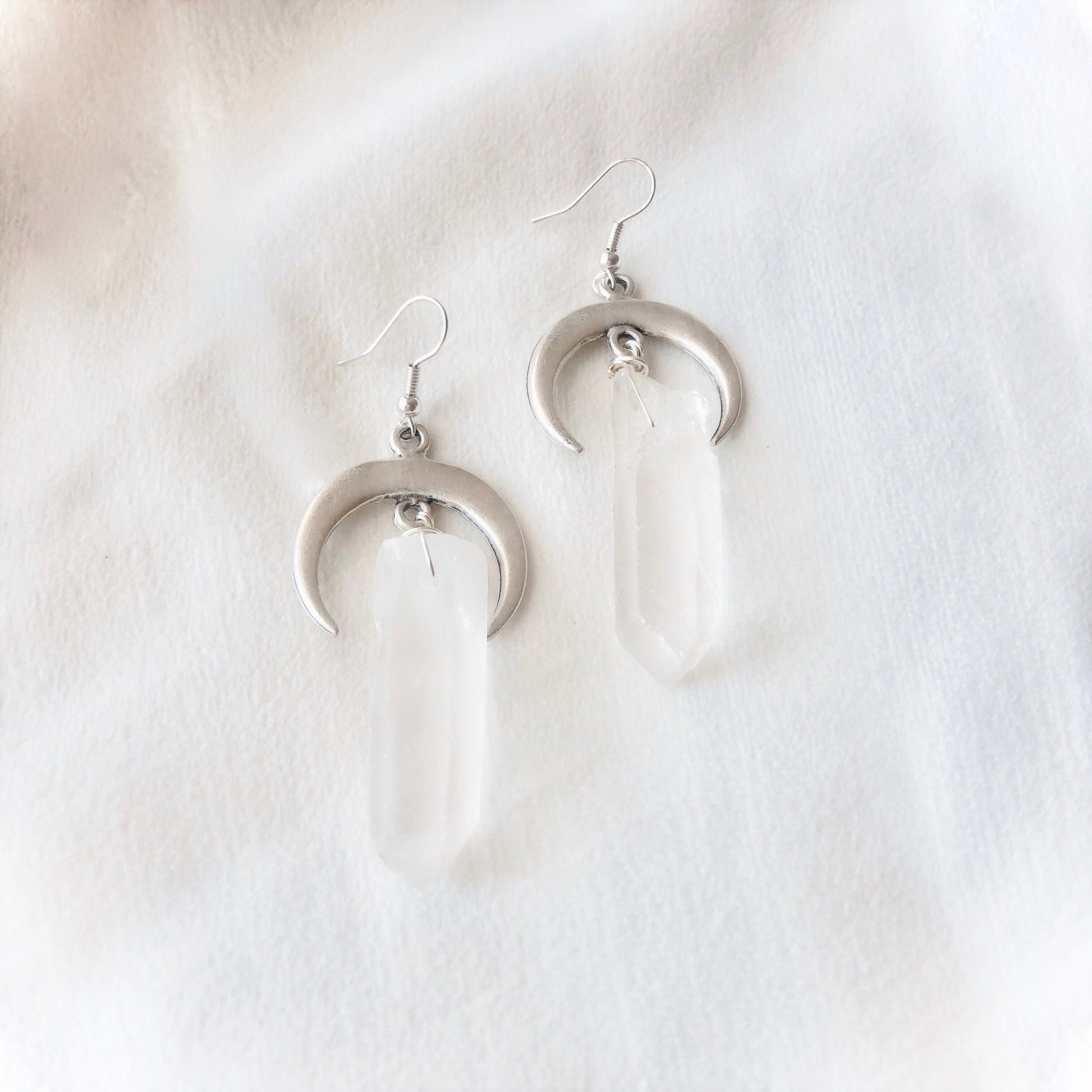 ♡ A quartz crystal measuring approximately 1.5 inches hangs from each crescent moon