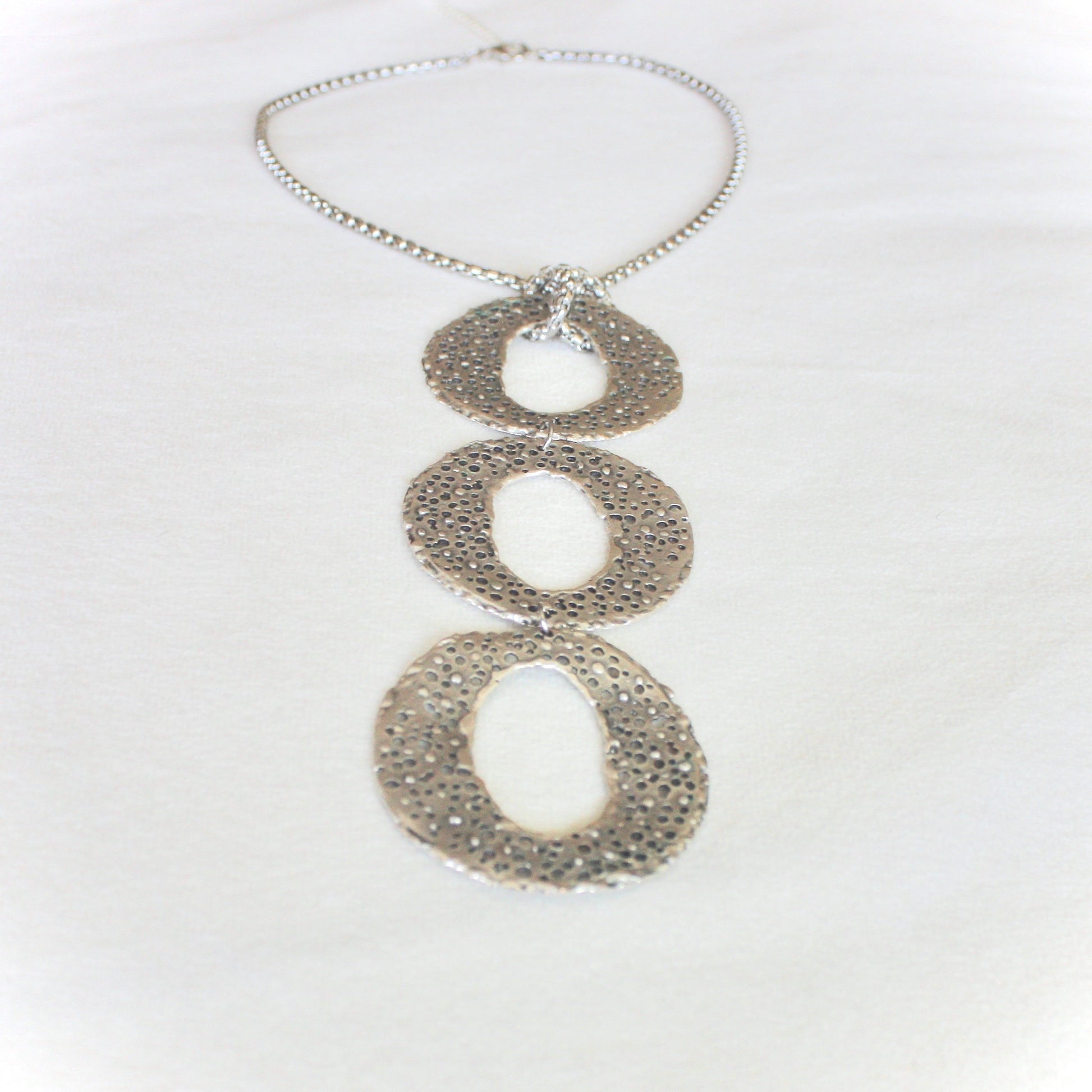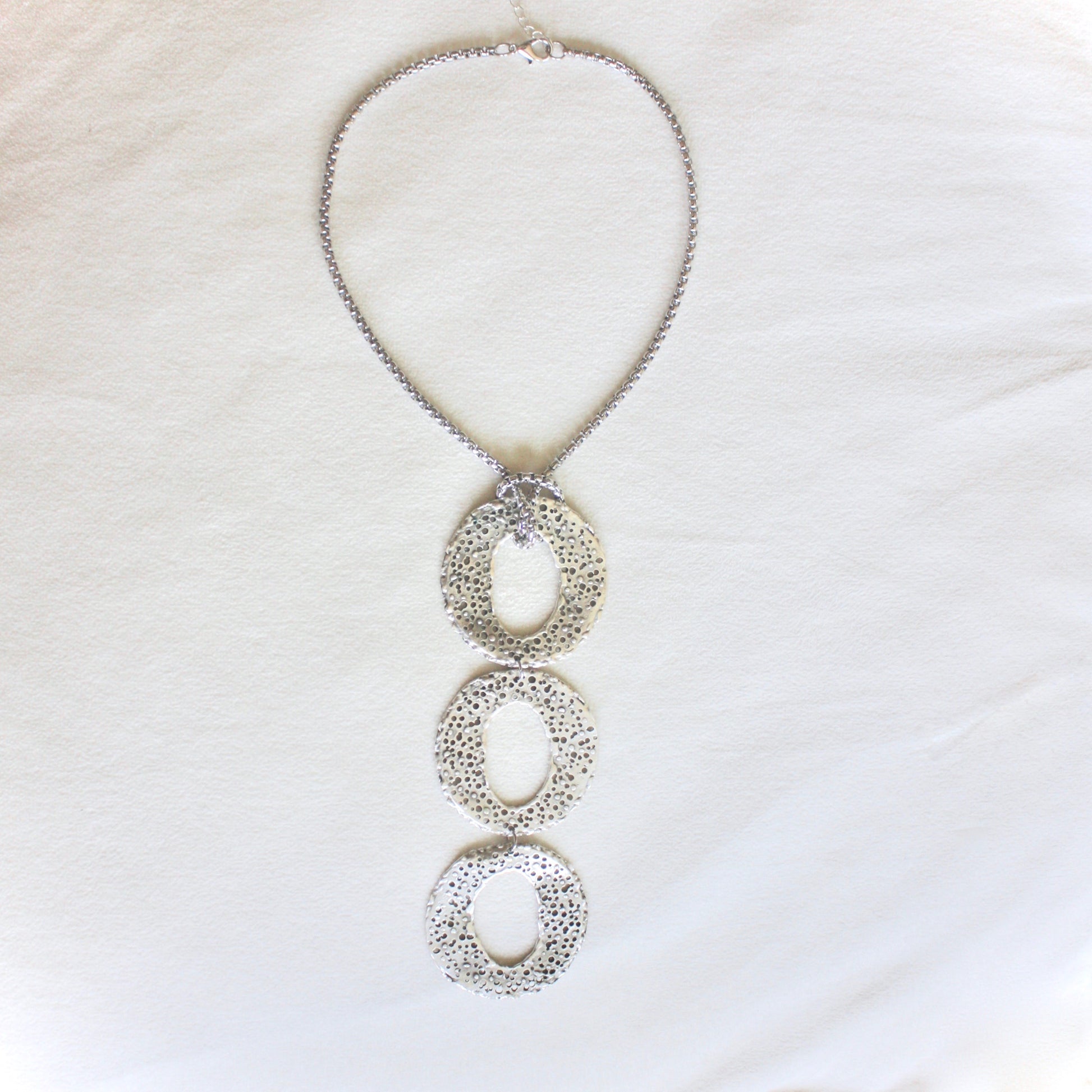 ♡ Featuring three antique silver plated circle pendants