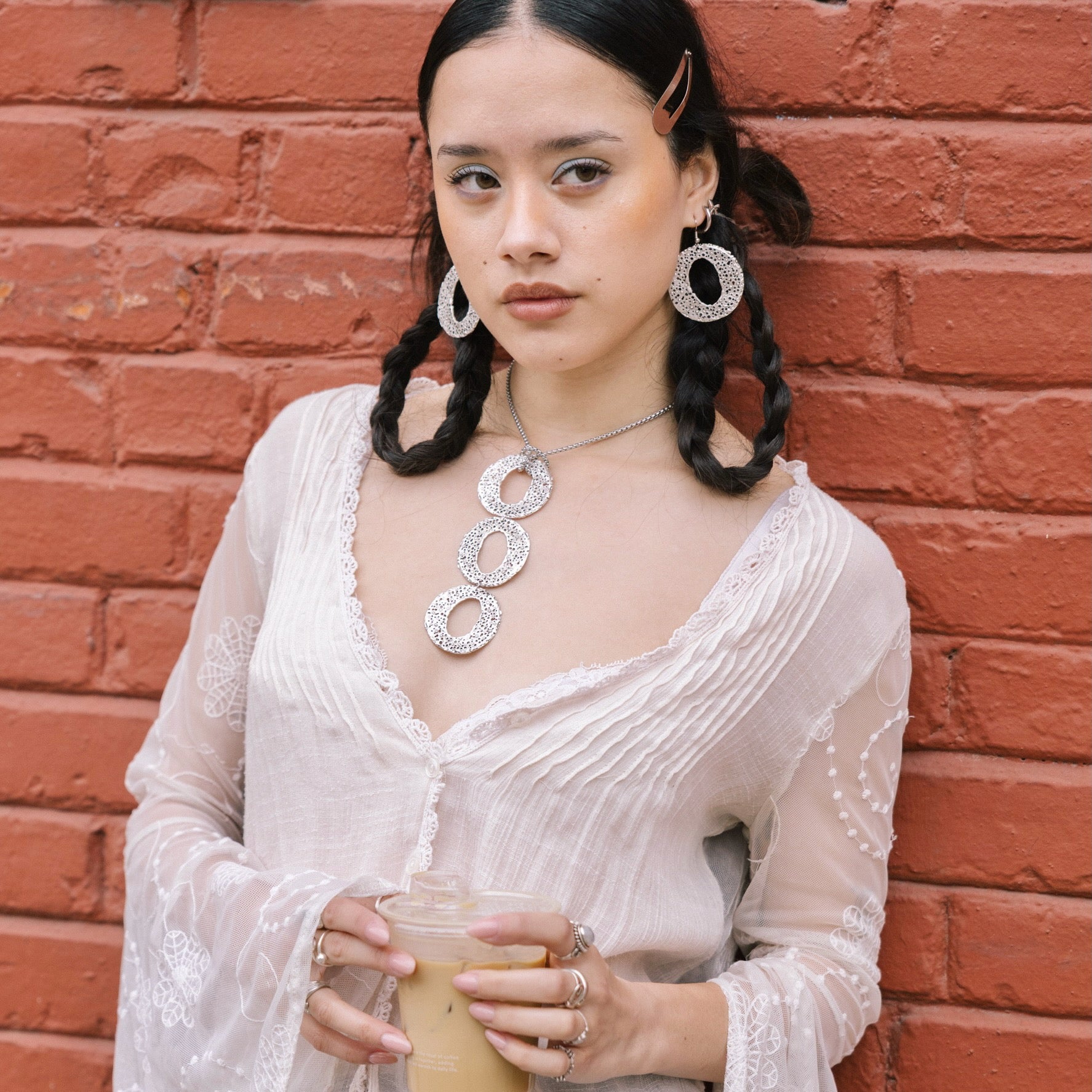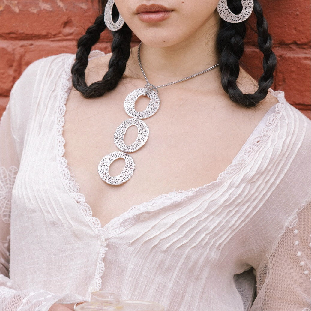 A perfectly imperfect choker. Featuring a texture similar to coral - with little perforations and cutouts. This dangly choker is alluring and eye-catching. Wear with a silk v neck top for a more elegant occasion, or dress it down with whatever top you choose. Enjoy this handmade choker, the counterpart to the Holeness Earrings ♡