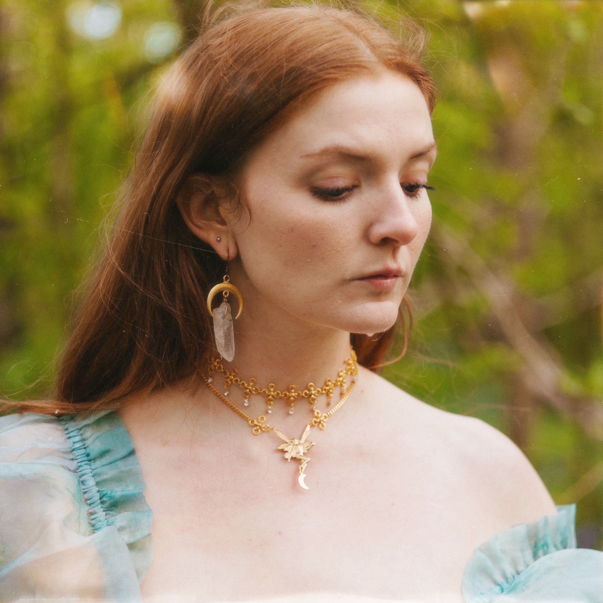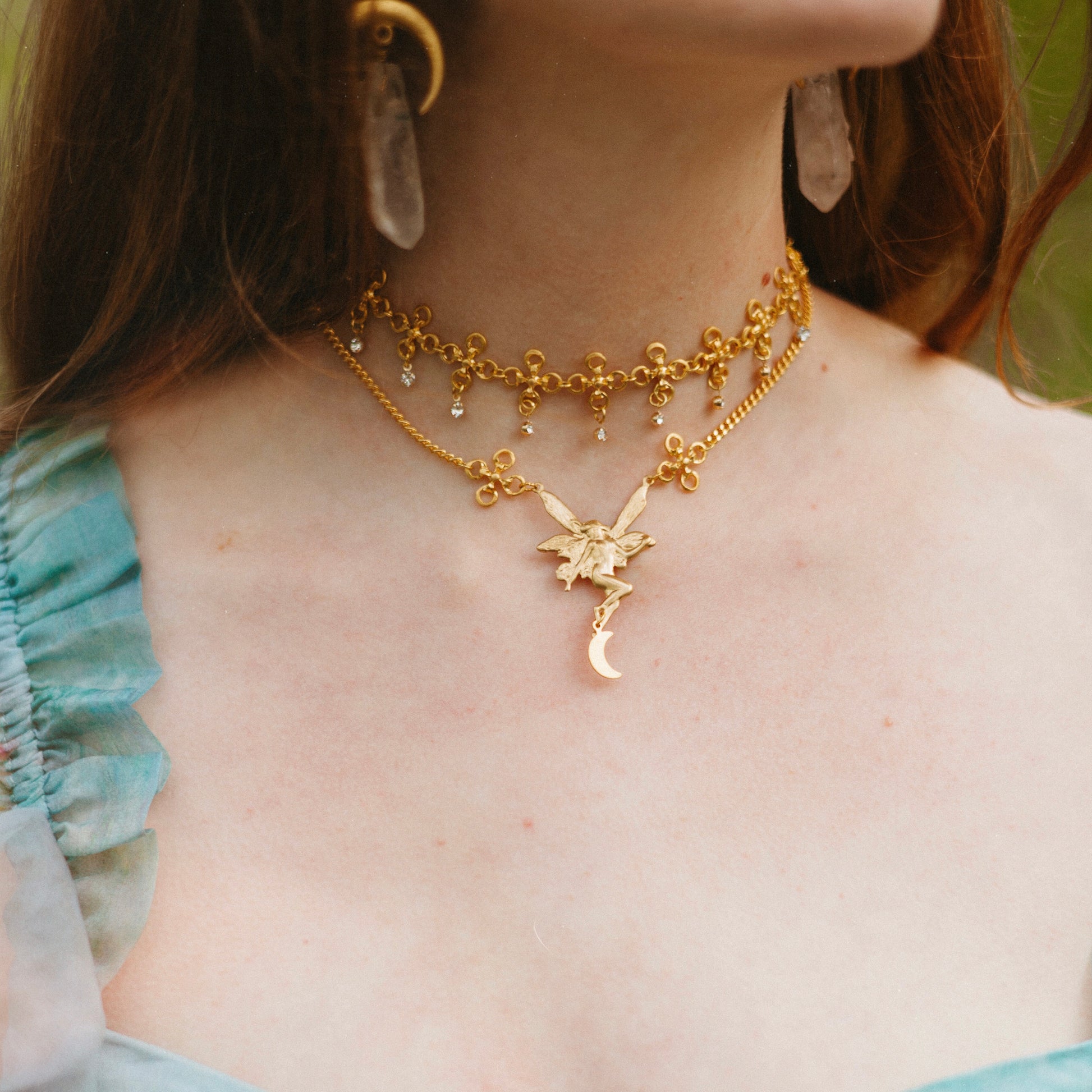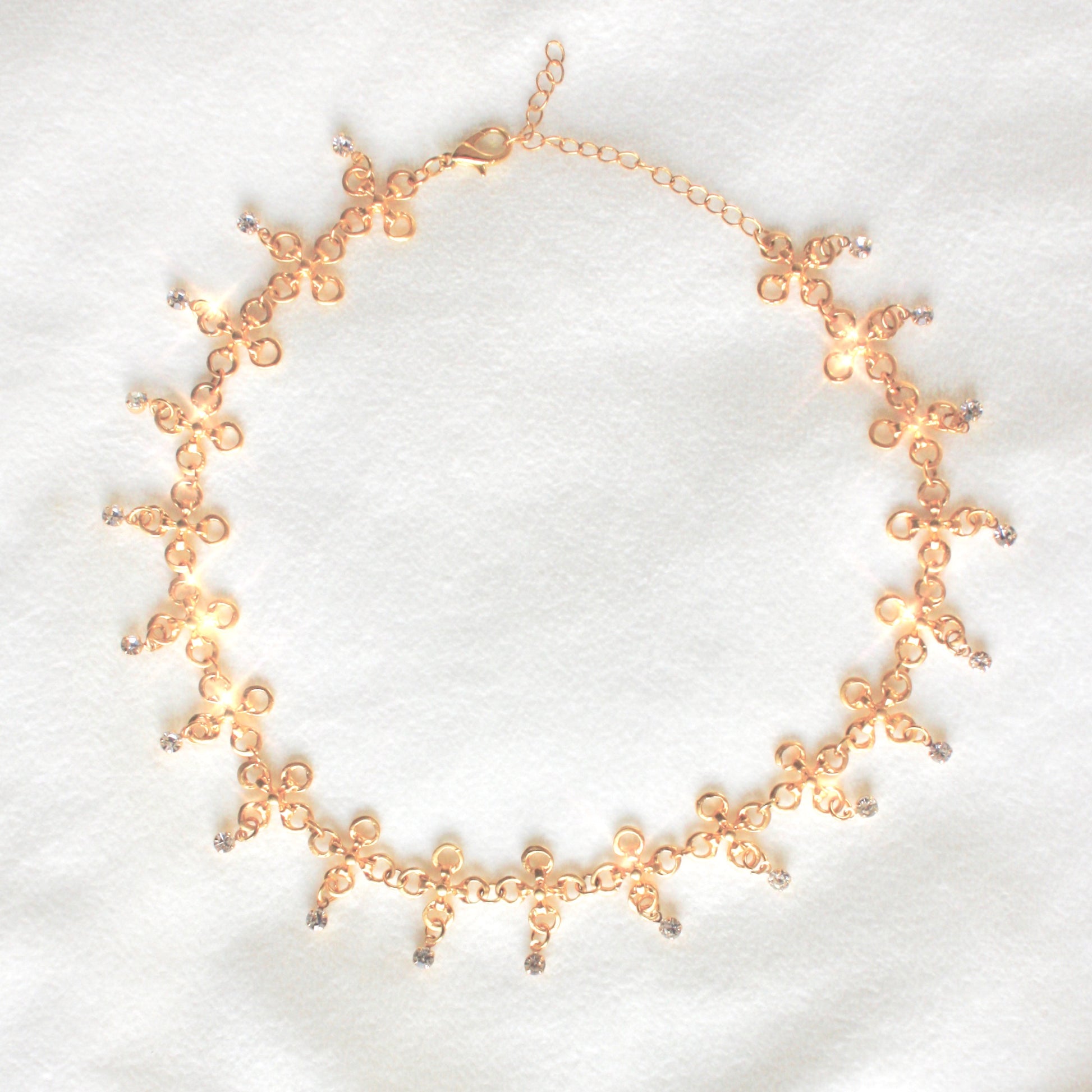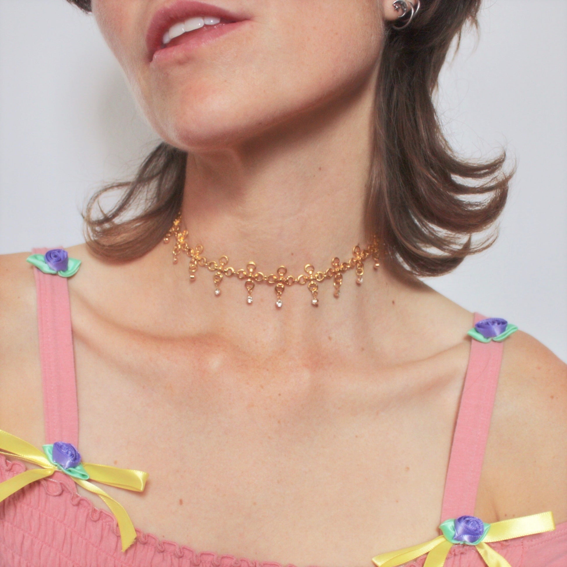 A cross choker that is all about interconnectedness and unity. Featuring interlocking gold flower charms with the most dainty, dazzling rhinestones. A fantasy-inspired piece with Renaissance and medieval qualities to make you feel like a fairy queen. My favorite part about this choker is that it can take center stage or instantly revamp a toned down outfit ✨ Enjoy this fairycore original ✨