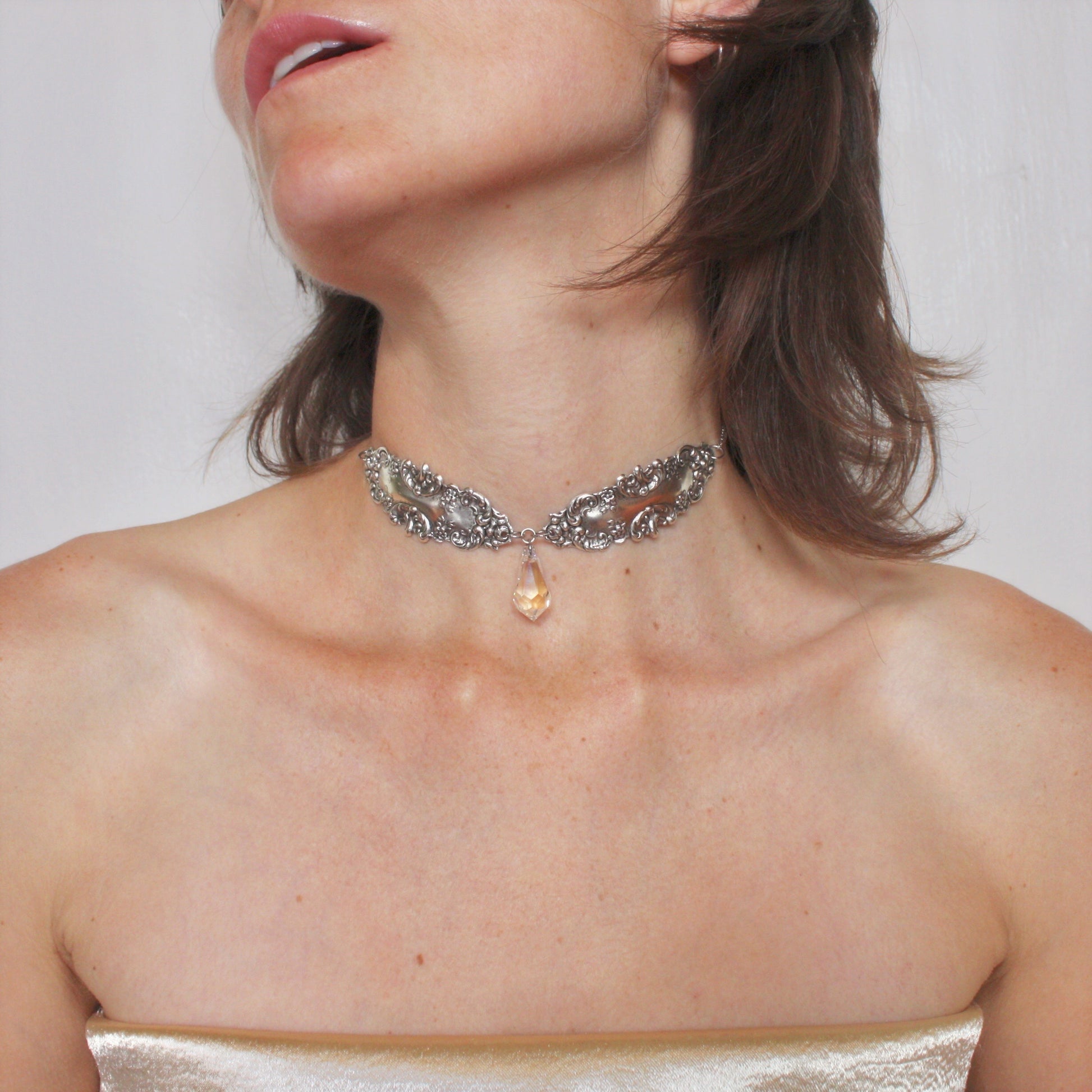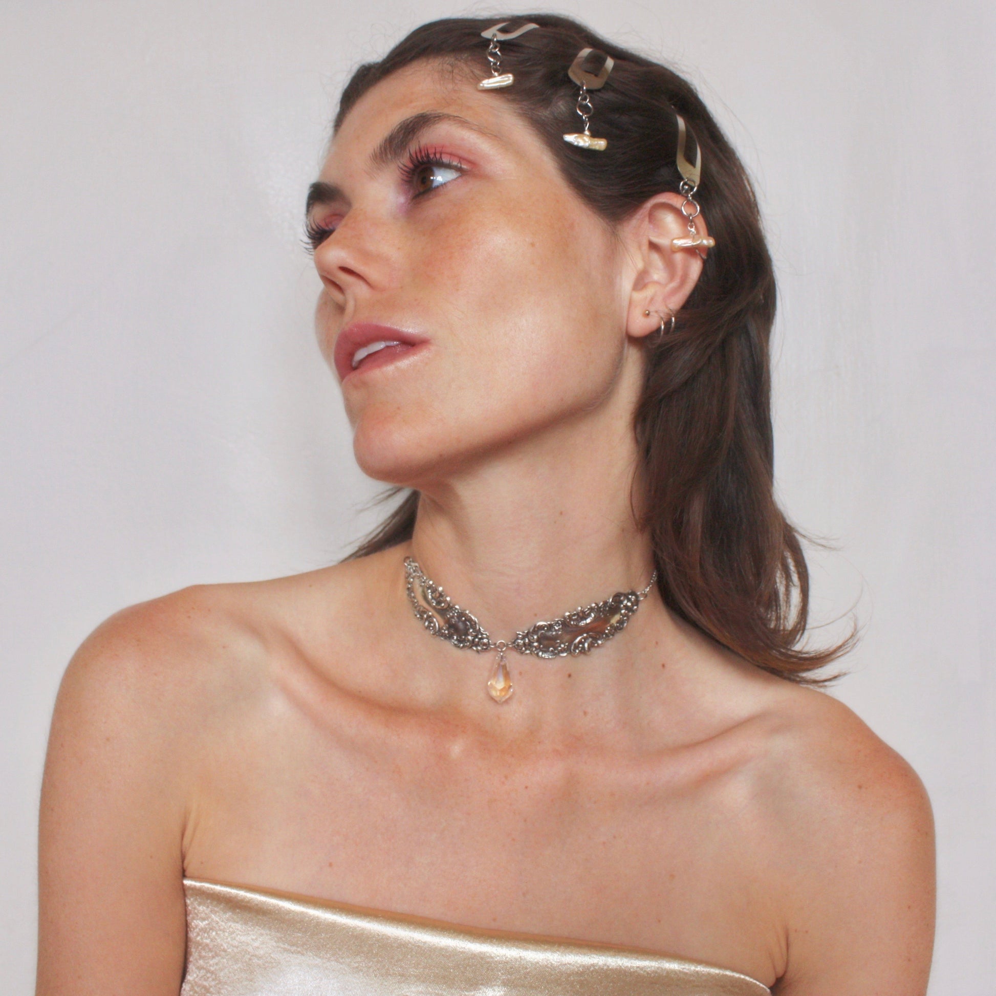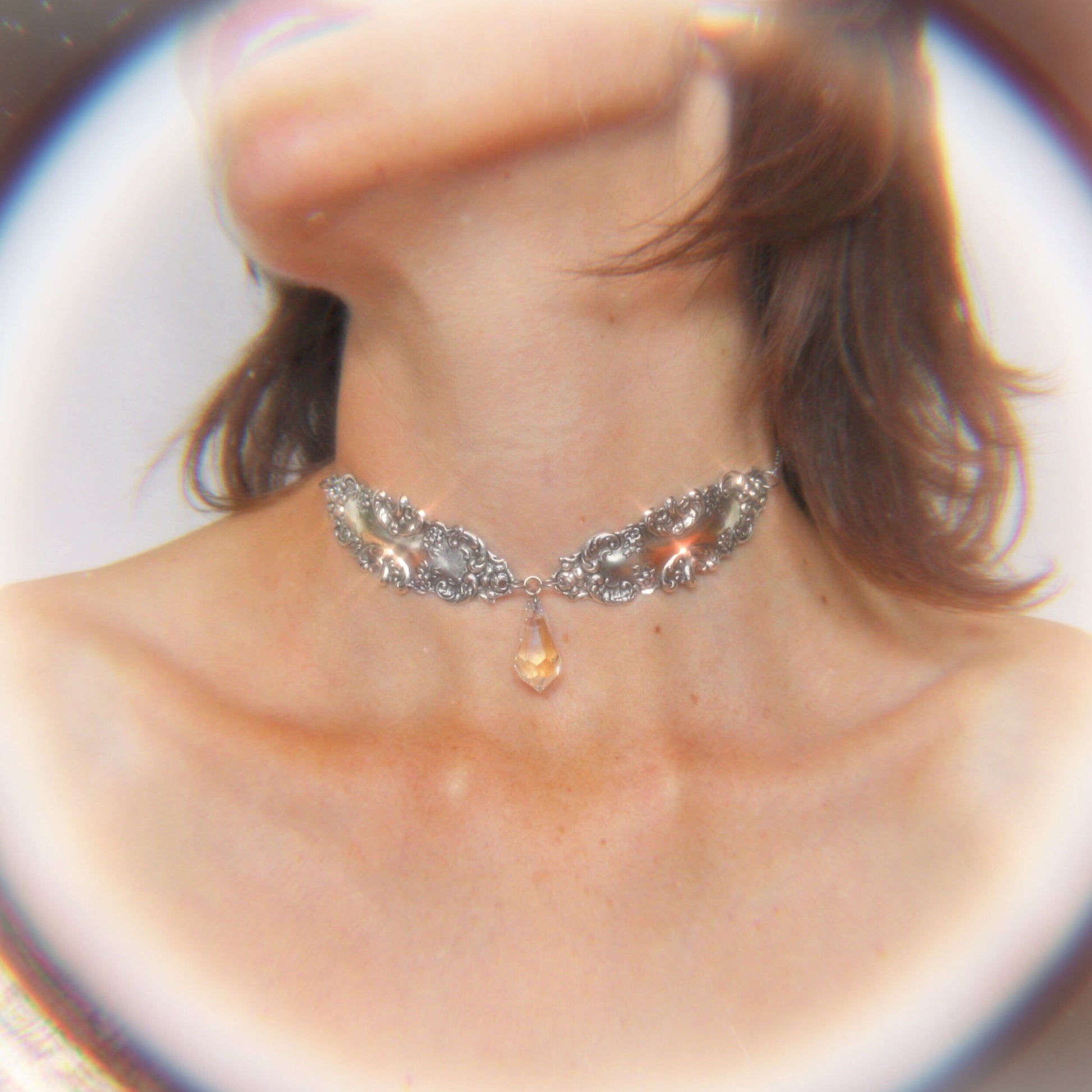A regal, victorian-inspired piece, the new 'Mirrors' Choker will be stealing the show. It features a large iridescent teardrop crystal that casts prisms when hit by sunlight. The antique silver pendants on either side of the rhinestone are bent into a collar so as to fit your neck just right. It is an elevated fantasy piece that does not disappoint. Enjoy ♡