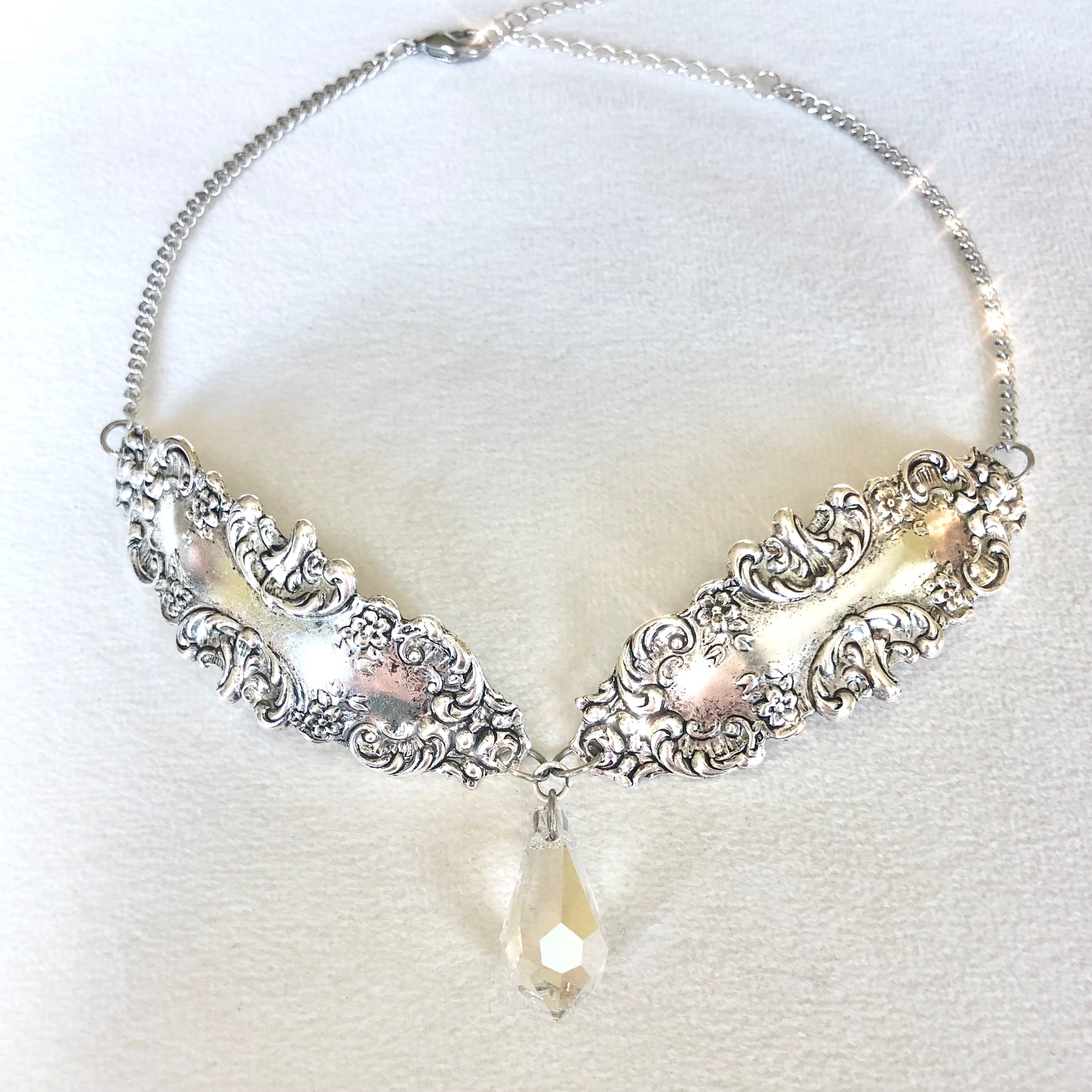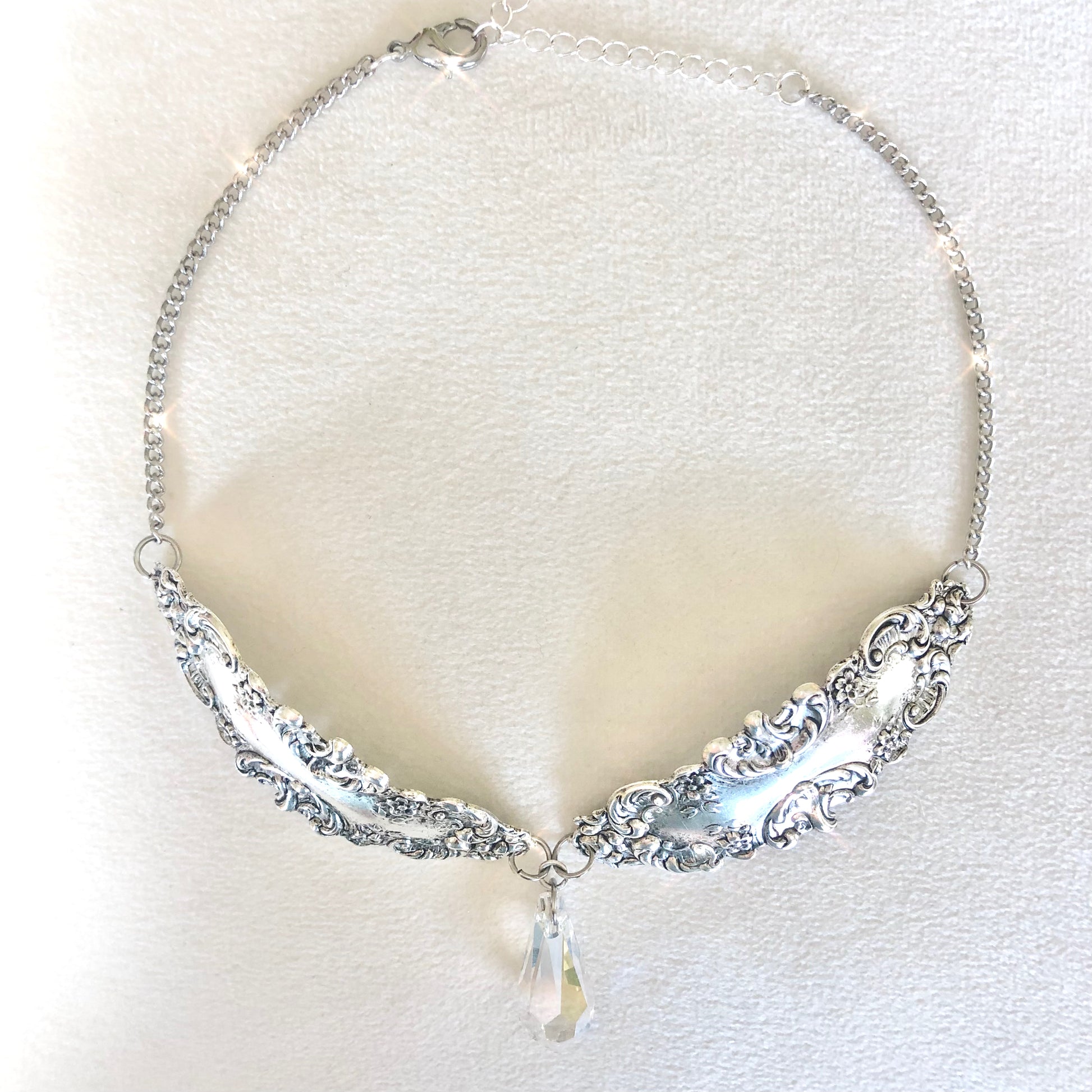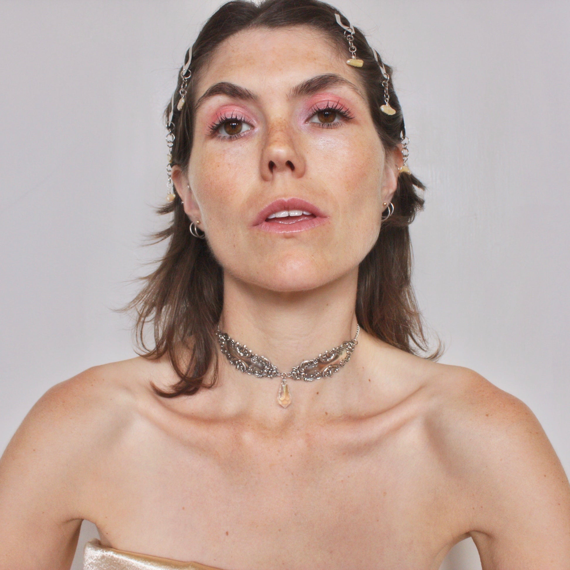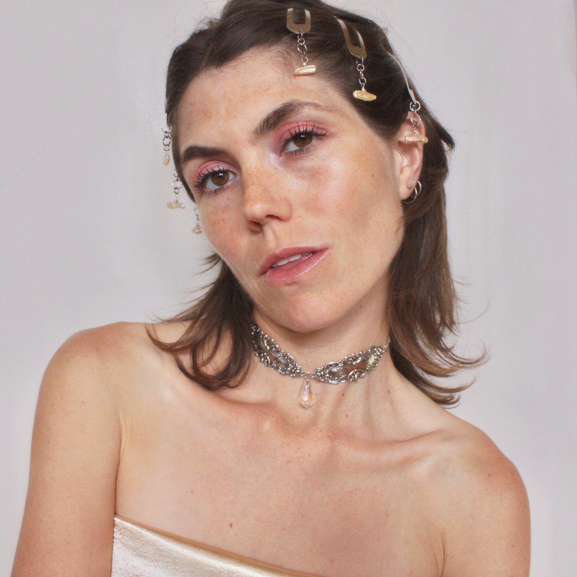 A regal, victorian-inspired piece, the new 'Mirrors' Choker will be stealing the show. It features a large iridescent teardrop crystal that casts prisms when hit by sunlight. The antique silver pendants on either side of the rhinestone are bent into a collar so as to fit your neck just right. It is an elevated fantasy piece that does not disappoint. Enjoy ♡
