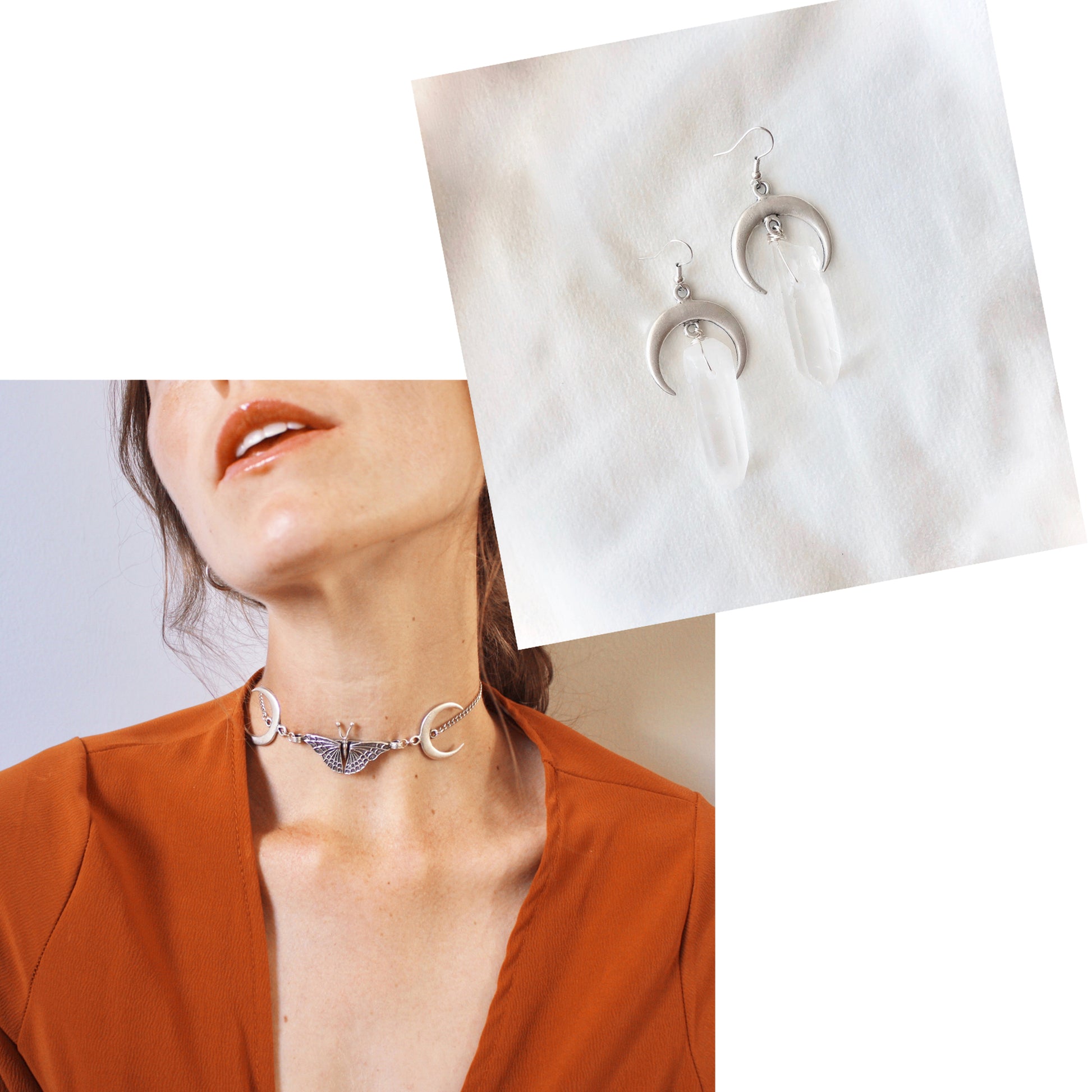 ♡ A quartz crystal measuring approximately 1.5 inches hangs from each crescent moon
