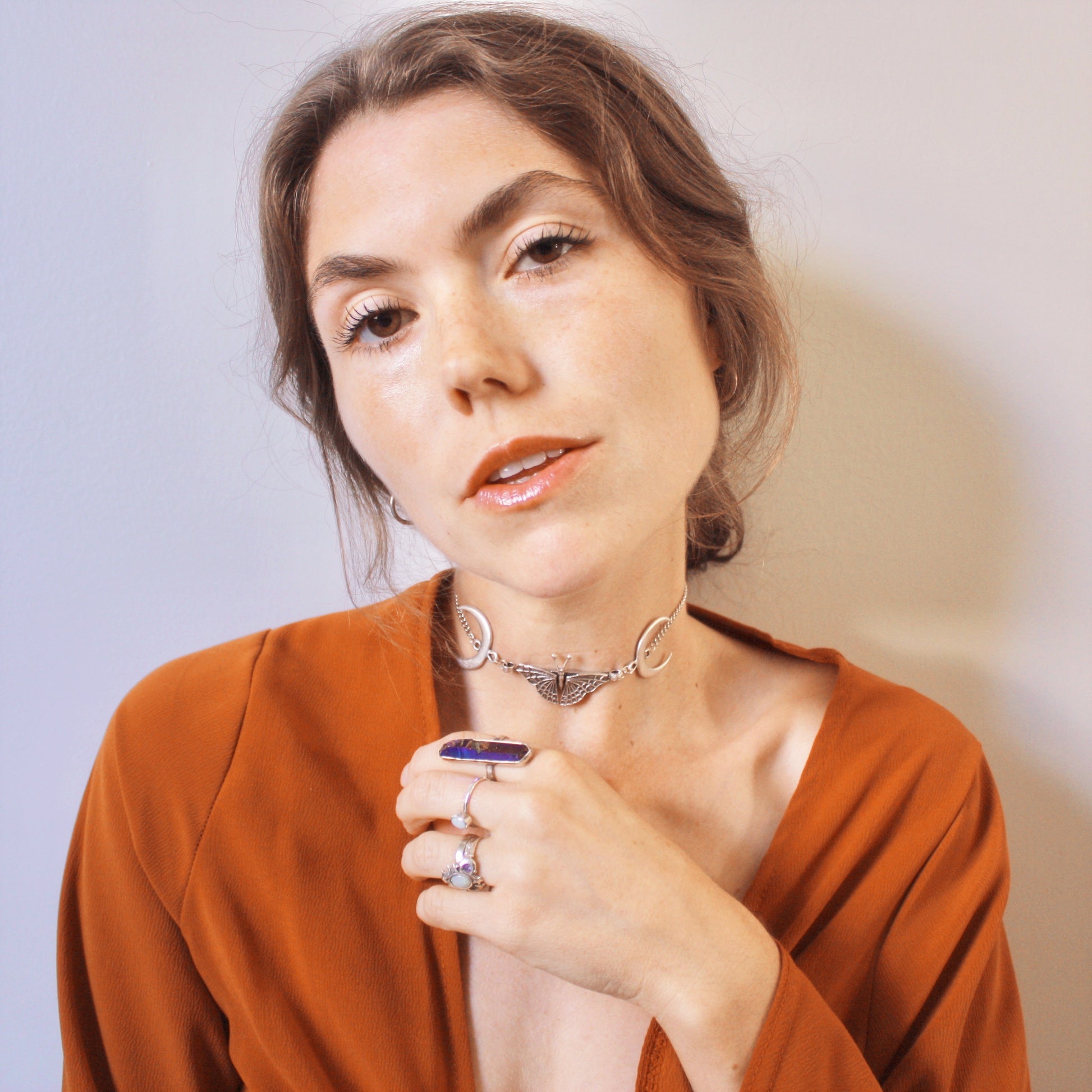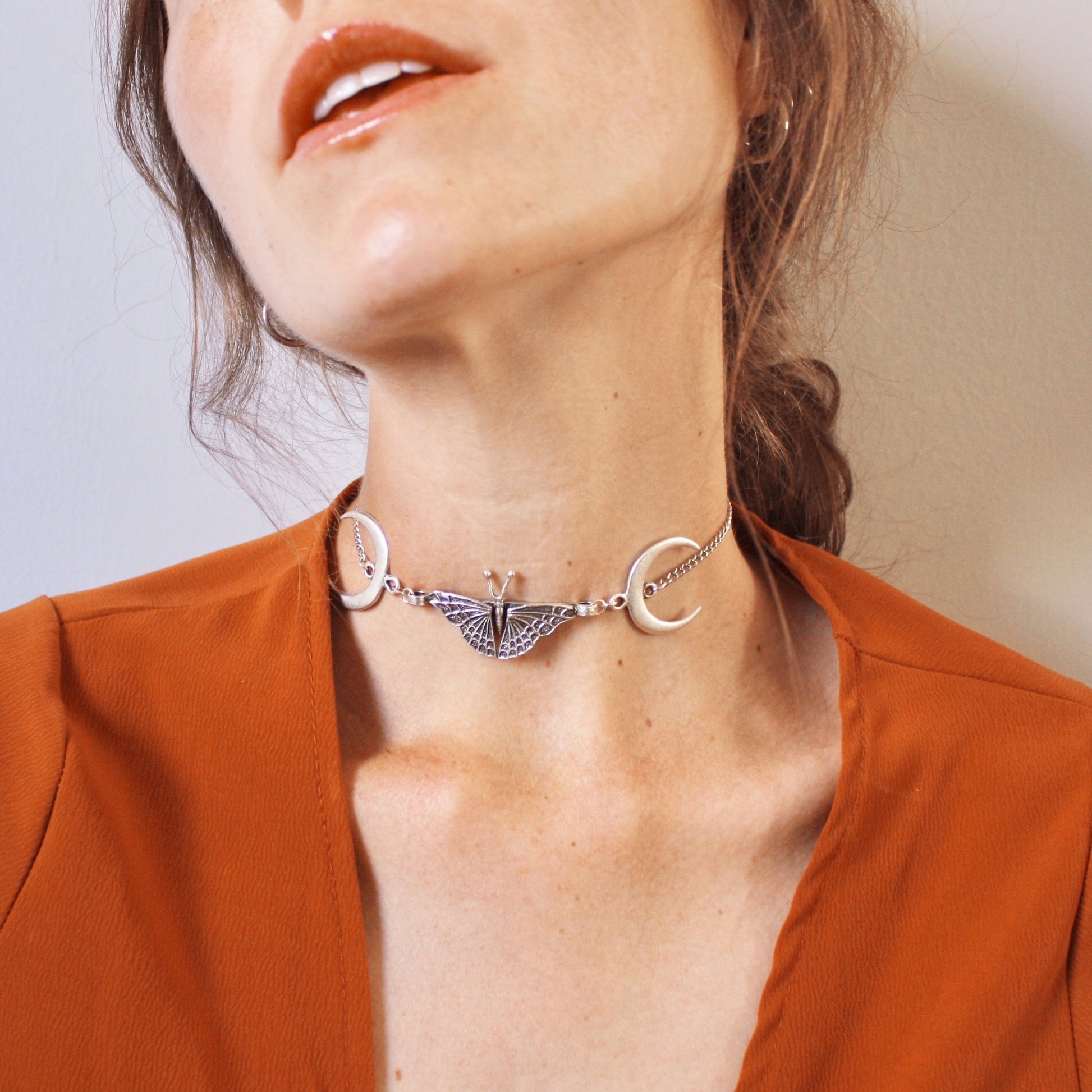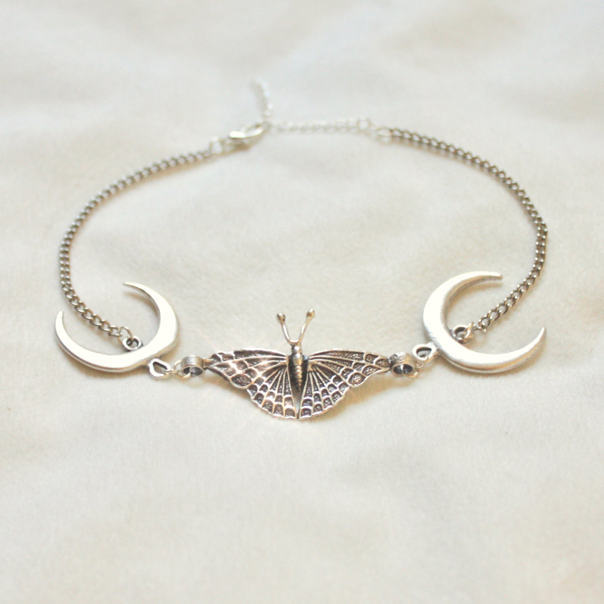 A beautiful place in the woods with all your friends ♡ Moons and butterflies, what more could you ask for? A more statement take on the ‘Happiness is a Butterfly’ Choker, this nature-inspired choker has gothic influences with an intricate butterfly pendant and two crescent moons. It is the perfect piece to wear with an oversized vintage tee and skinny jeans, or with any outfit, really. Enjoy this silver celestial choker, handmade with love ♡