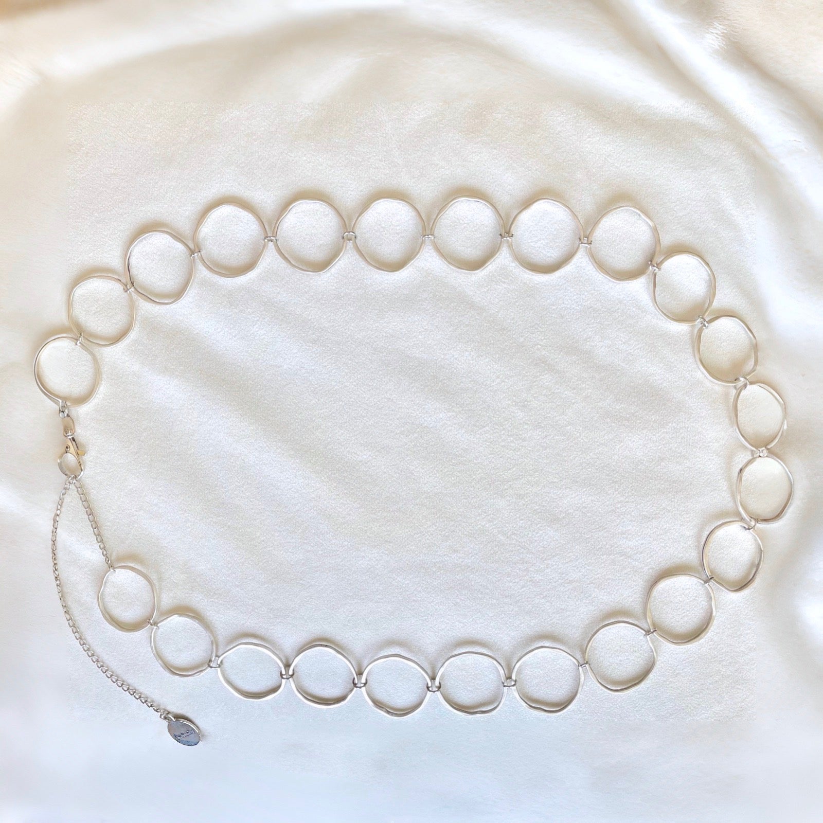 Think of the 'Silver Linings Belt' as the 'Full Circle (XL)' Belt's dainty, feminine sister. More modest and less out-there, this belt is suitable for daily wear. Wear it with high-waisted jeans, a pleated mini, a sweater dress - the options are virtually endless! Enjoy this interlocking silver circle belt ♡ Adjustable + handmade with love ♡