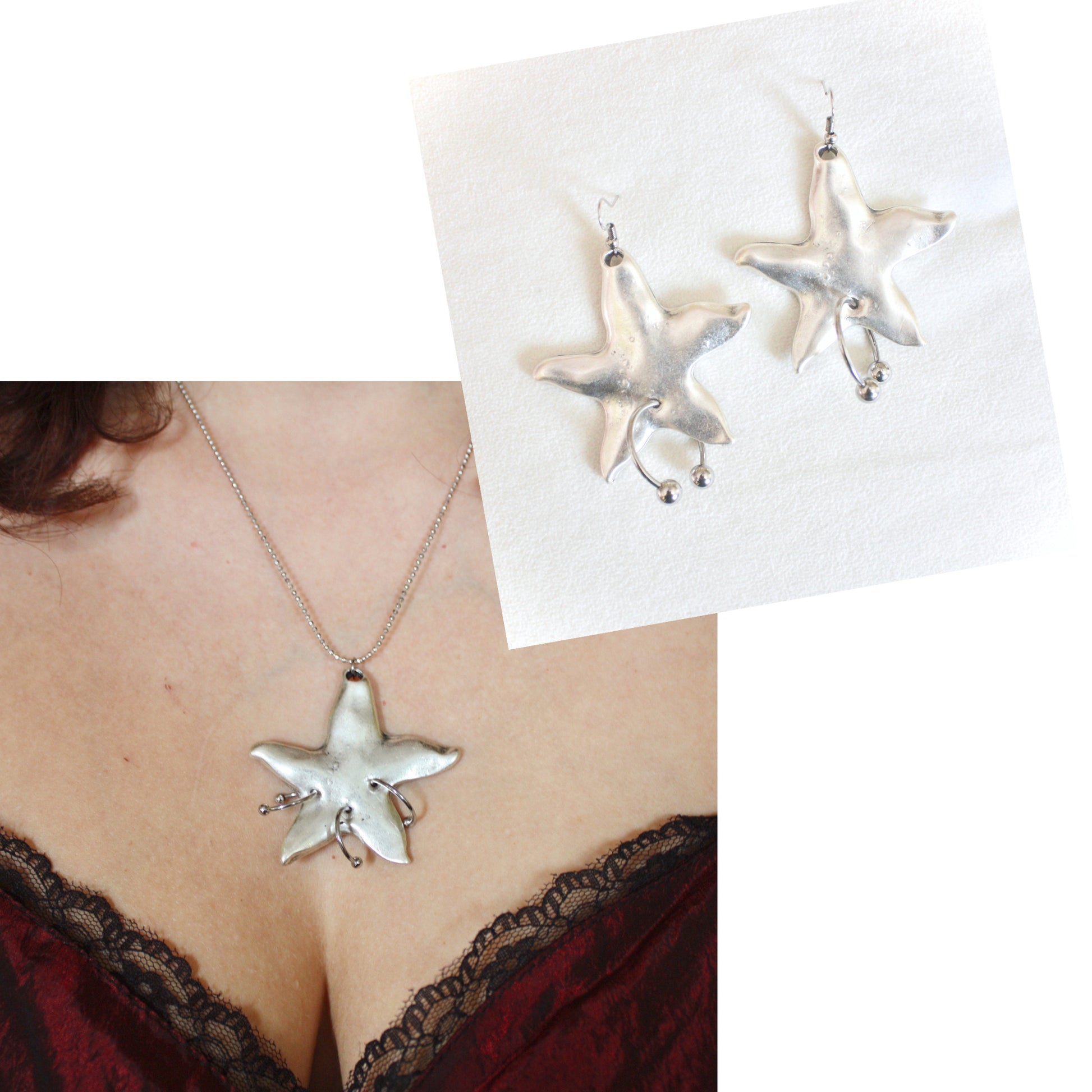♡ Featuring two antique silver plated starfish pendants