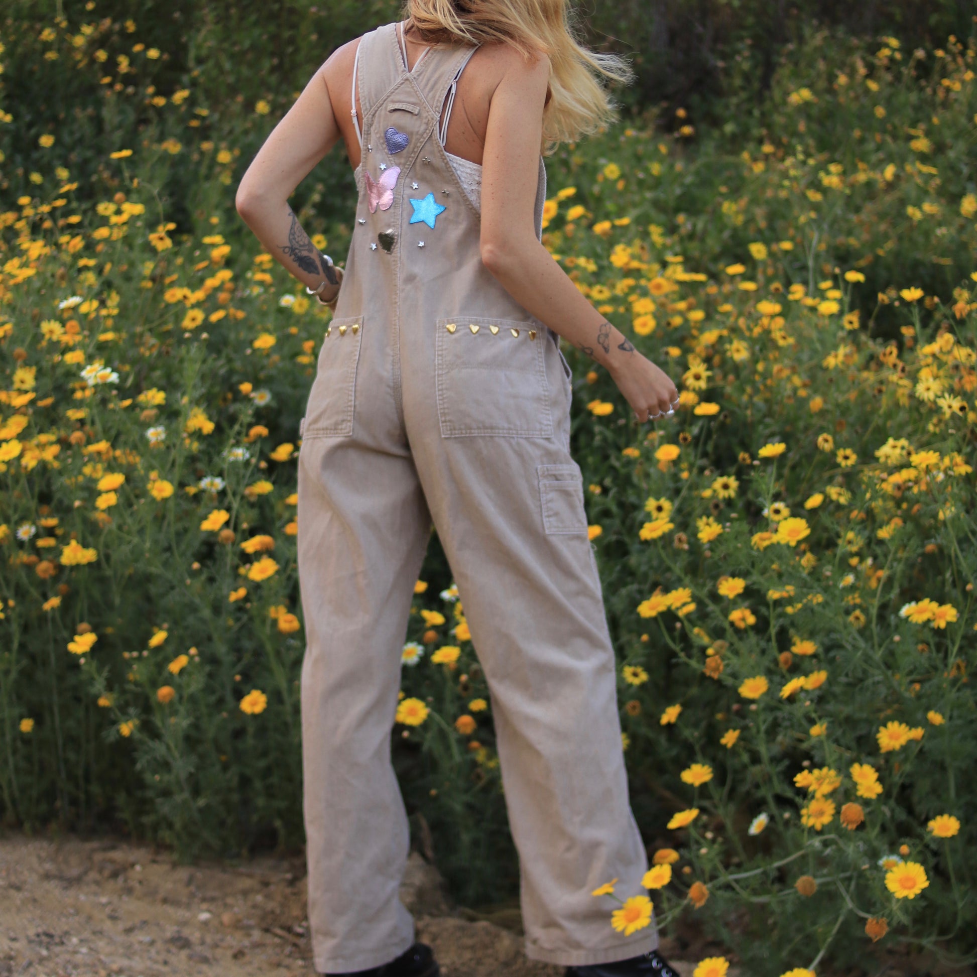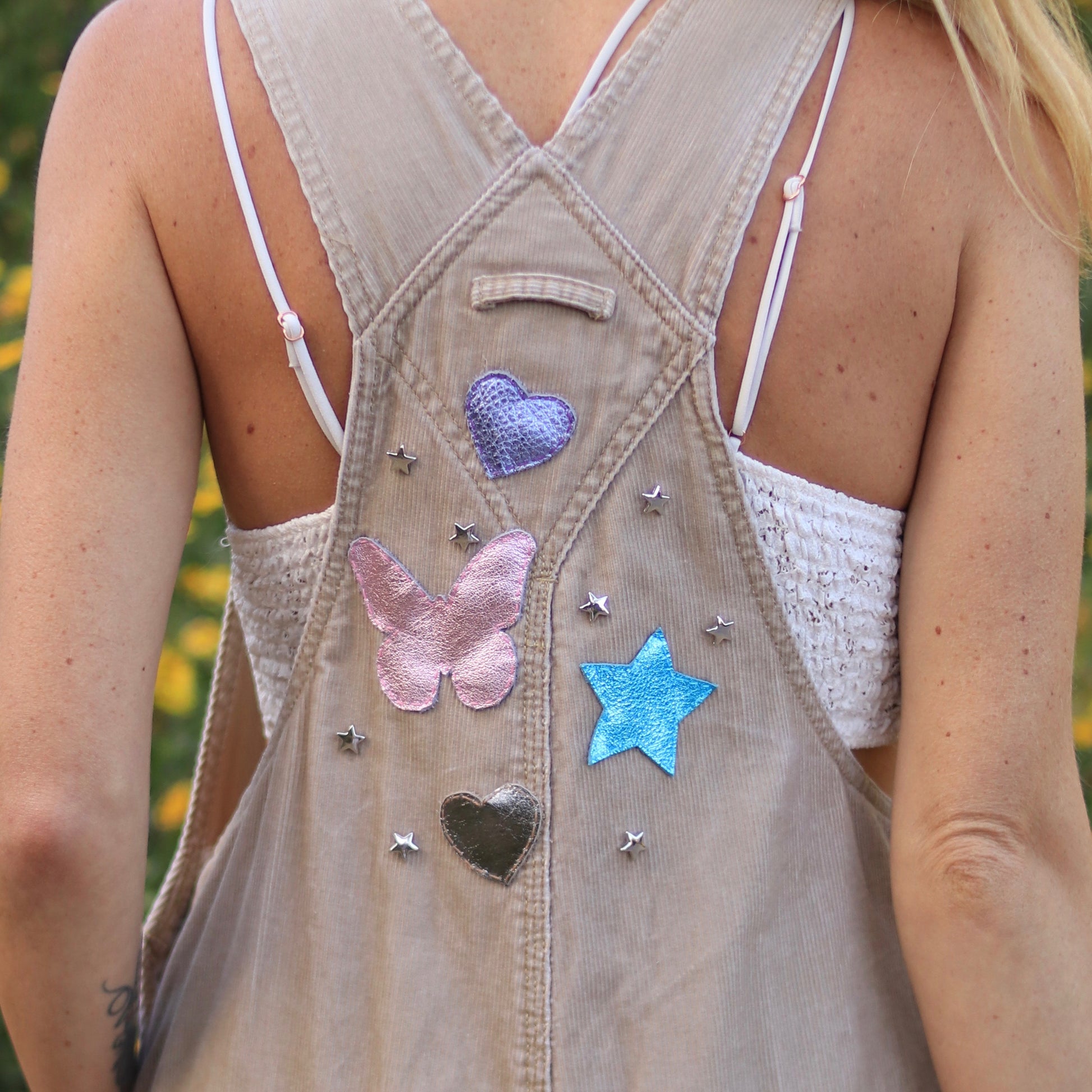 This beige pair of vintage overalls are upcycled to perfection and completely one-of-a-kind. These corduroy women’s overalls feature metallic leather scraps hand sewn into the shape of butterflies, stars and hearts. Wear these patchwork overalls with a crop top and docs for the ultimate 90s look. Vintage star studs adorn the back and brass heart studs adorn the pockets and suspenders. These corduroy overalls are labeled size medium (although they would fit size small depending on how oversized you want the look) ♡ A beautiful piece of reworked vintage clothing to add some 90s flair to your wardrobe ♡ Enjoy!