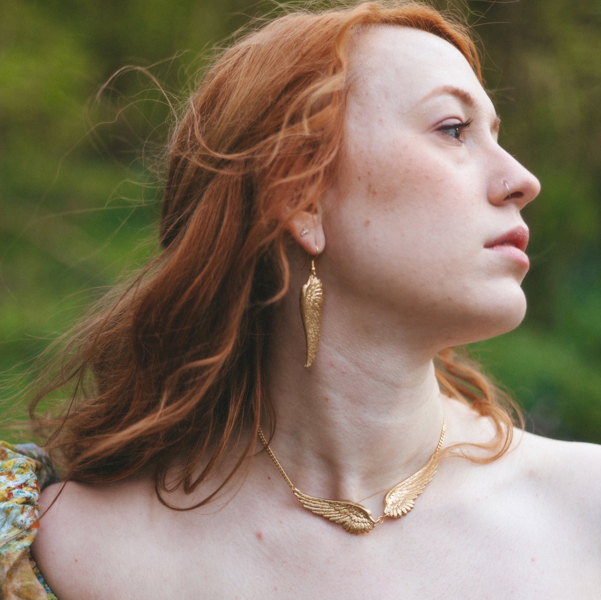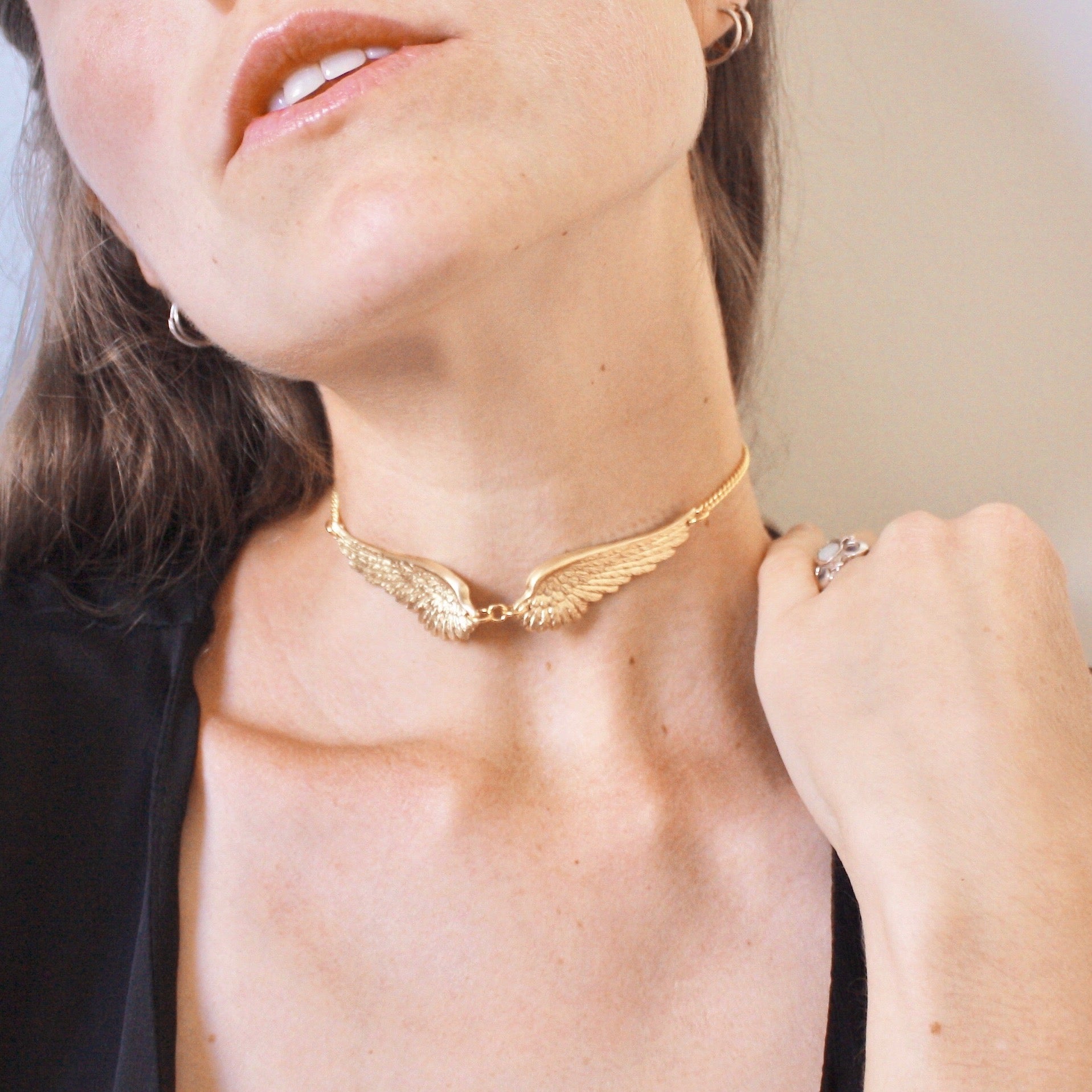 An angel choker that is a reminder of protection and love from above. You are always guarded, you are always grounded ♡ This gold angel necklace features two gothic wing pendants on thick curb chain. Dress it up with a puffy sleeve top or dress. Hint: this angel wing choker looks especially nice when paired with a v-neck. Enjoy this wing necklace, available in two sizes.