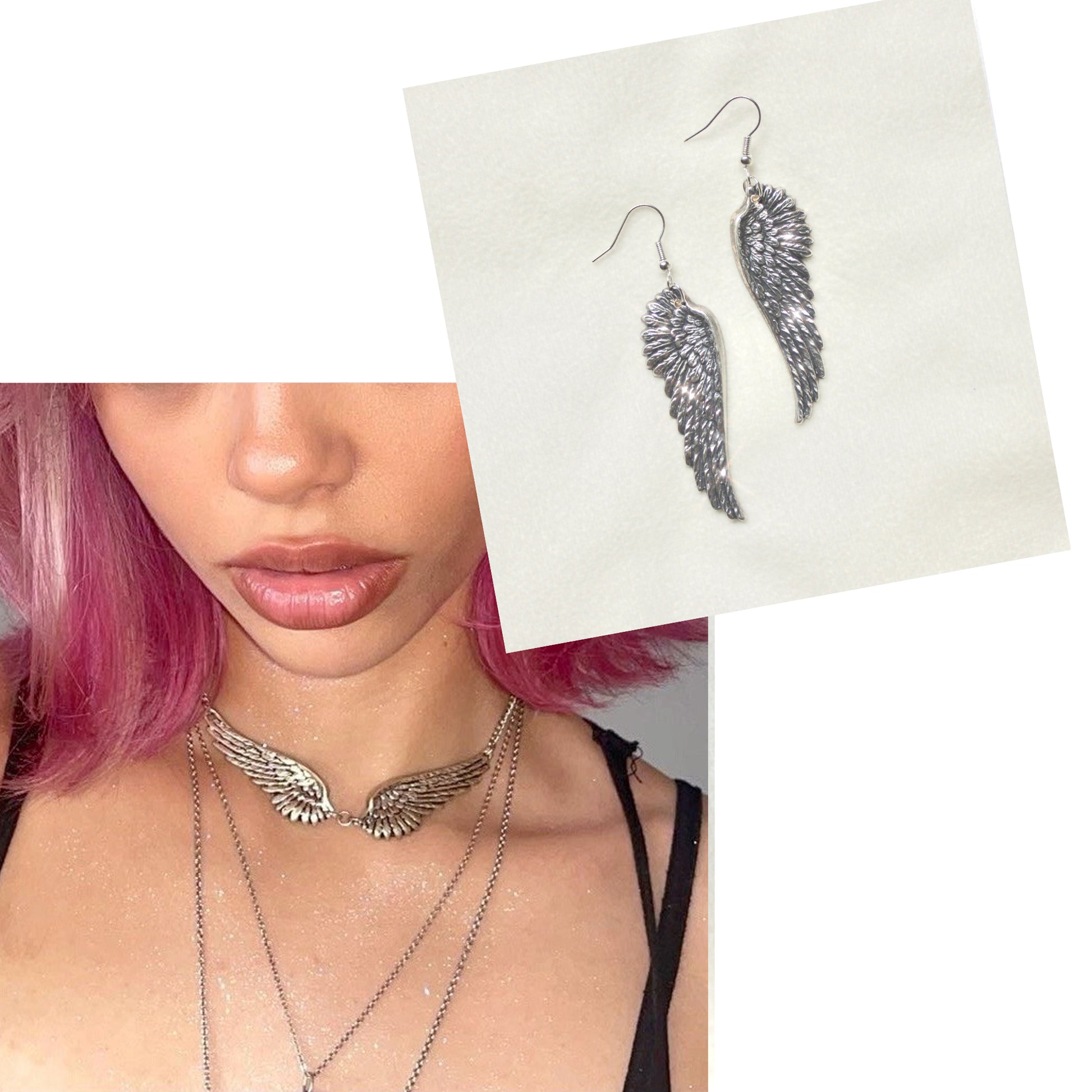 ♡ Featuring two antique silver plated angel wing pendants